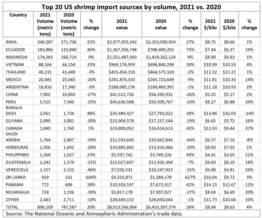 美国国家海洋与大气管理局(NOAA)统计,2021年全年美国进口虾产量896,109吨,比上年增长20%,进口额超过80亿美元,比上年增长24%,去年产品均价$8.94/kg,比去年上涨4%。