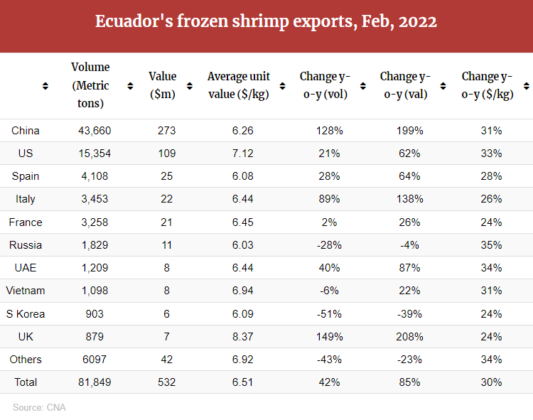厄瓜多尔水产养殖商会(CNA)统计,2022年2月份厄瓜多尔出口虾产量超过8.2万吨,比去年同期增长42%;出口额达到5.32亿美元,同比增长88%。
