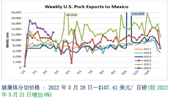 墨西哥继续为疲软的出口市场提供短暂的延缓;在美国猪肉出口的前12个国家中,有11个于3月17日当周出现同比下降。另一个发展中的不利因素为美元走强来自于美国利率上升推动的。上周,美元兑日元汇率创下6年新高。