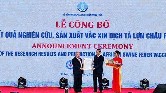 在公布仪式上,越南农业与农村发展部向越南中央动物药业股份公司颁发非洲猪瘟疫苗上市许可证。