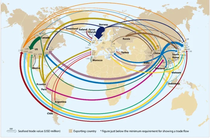 Gorjan Nikolik请大家注意地图上列出的一些更重要的贸易流,其中最大的是“价值87亿美元的三文鱼贸易流”,它从挪威延伸到欧盟,途经丹麦、德国、荷兰、法国和西班牙。