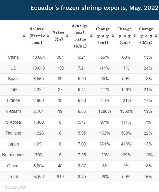 厄瓜多尔水产养殖商会(CNA)统计,2022年5月份,厄虾出口量同比增长29%,达到9.5万吨,创下新的历史纪录,出口额达6.1亿美元,同比增长50%。