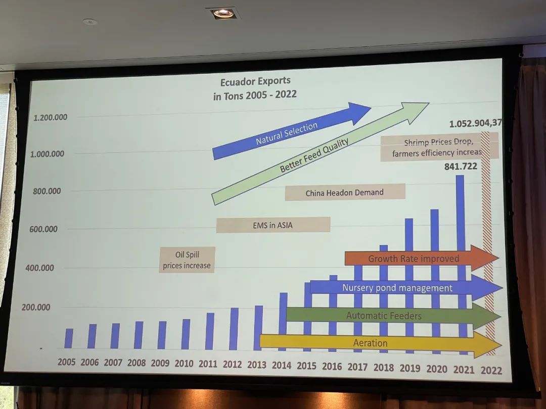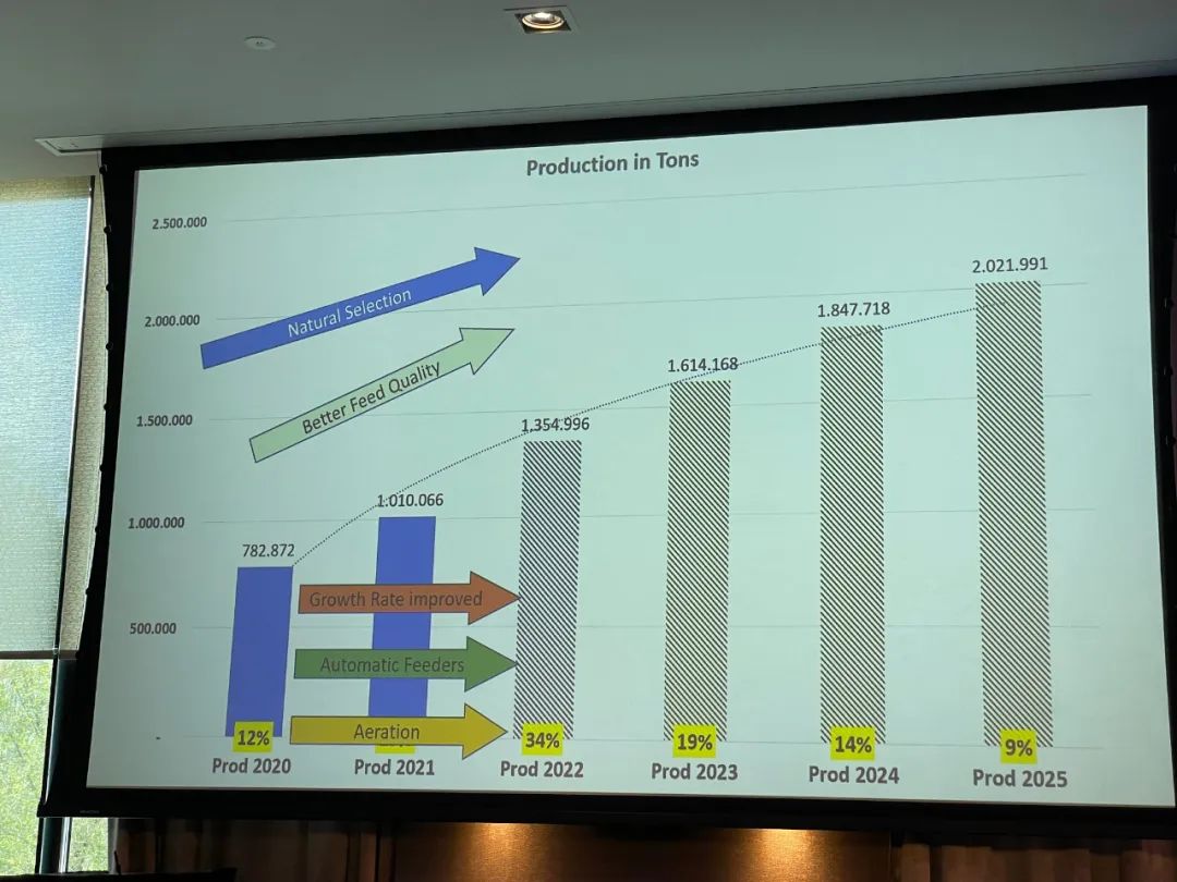 厄瓜多尔增长势头能持续多久?Luna回答:“没有永久的趋势,十年后我们可能无法再维持两位数的增长。厄瓜多尔养虾面积约22万公顷,但仅有25%实现了‘技术化’,这意味着增长空间还很大。”