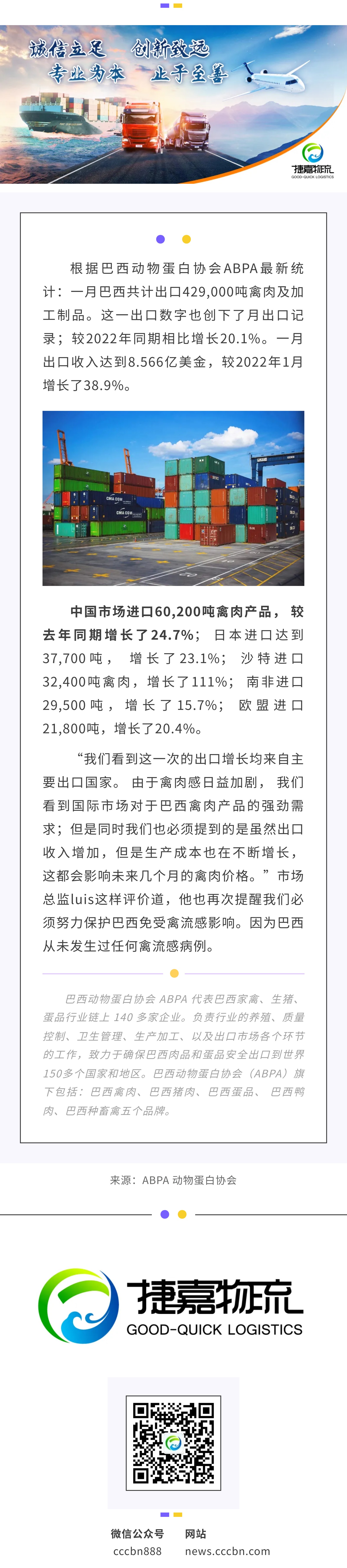 境外涉农 | 2023年1月巴西禽肉出口增长20.6%;中国、沙特、日本和欧盟主要市场增长强劲