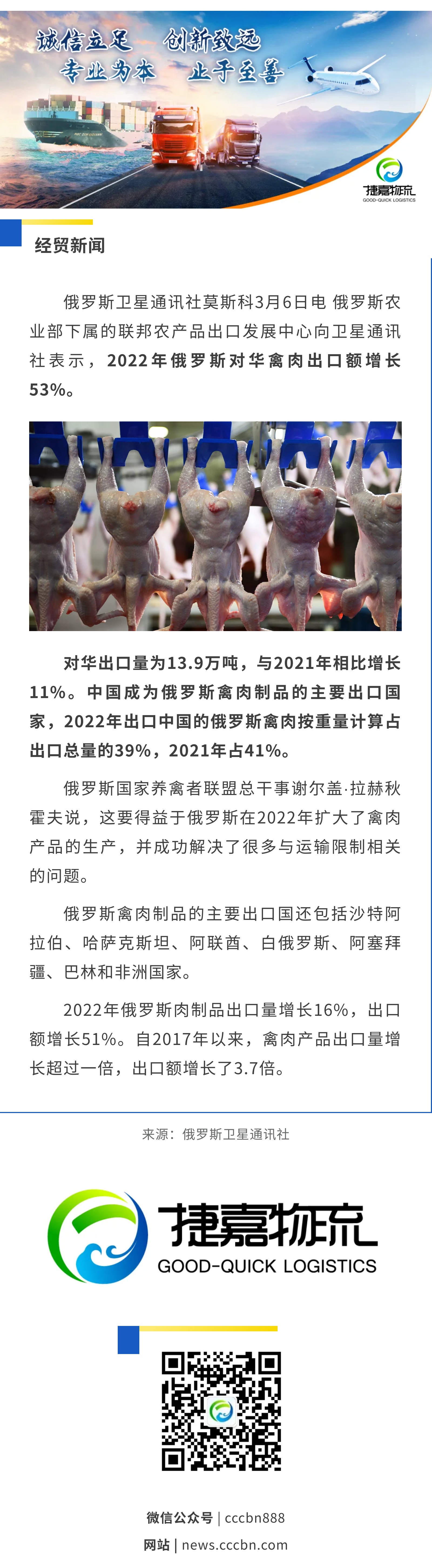 境外涉农 | 俄农产品出口发展中心:2022年俄罗斯对华禽肉出口额增长53%