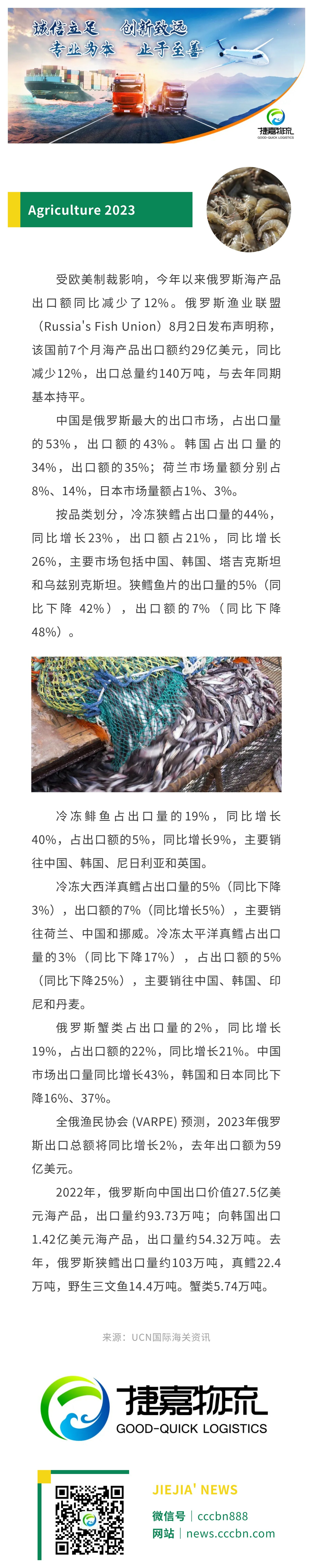 境外涉农 | 前7个月,俄罗斯海产品出口额下滑12%,中国市场贸易大幅增长