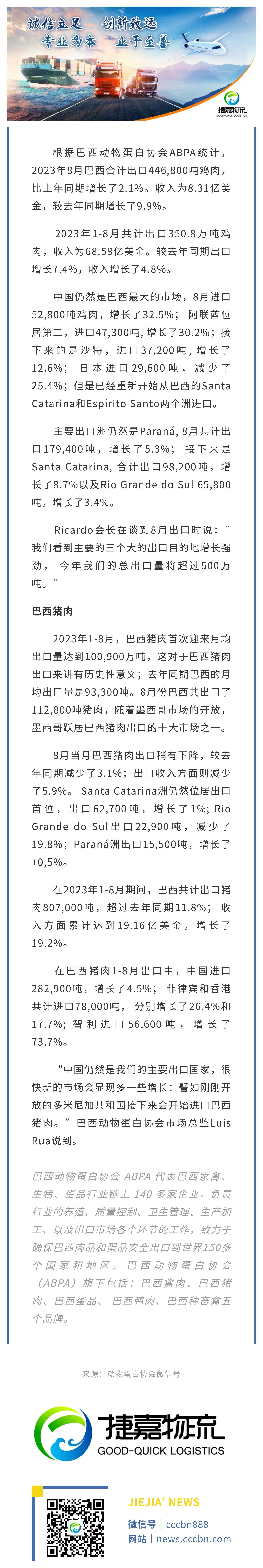 境外涉农 | 8月,巴西鸡肉全球出口增长2.1%、猪肉全球出口减少3.1%