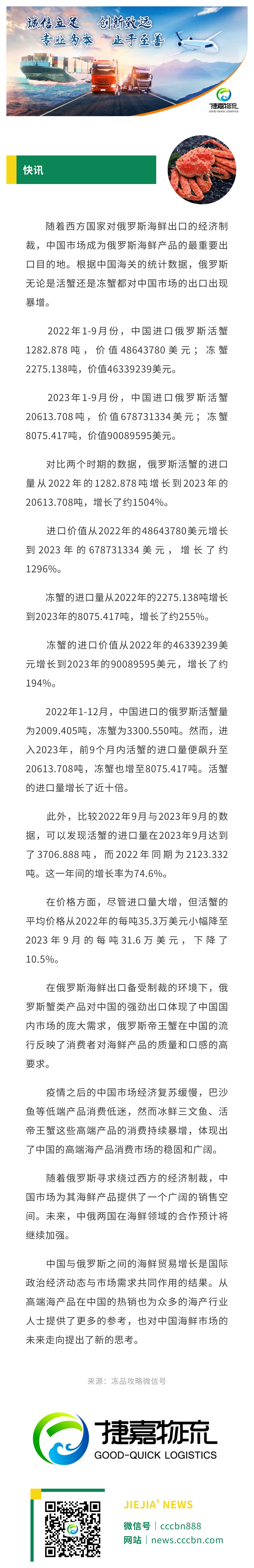 境外涉农 | 高端海产消费稳定,俄罗斯活蟹对华出口飙增1504%