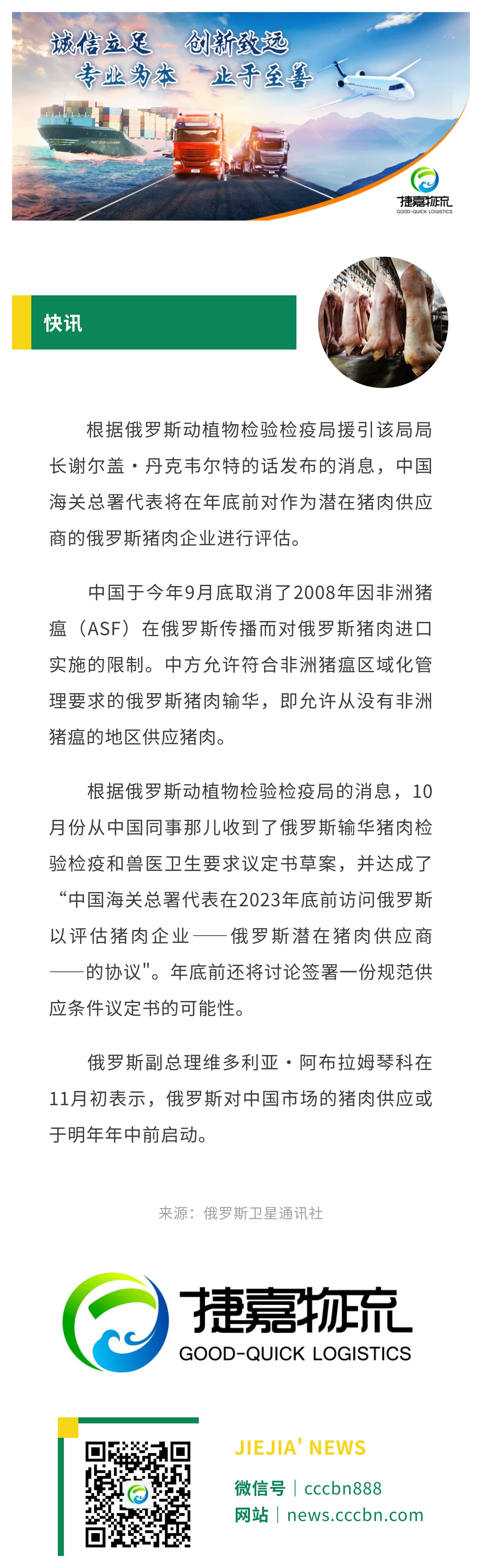 境外涉农 | 俄罗斯动植物检验检疫局:中国将在年底前审查俄罗斯猪肉的可能供应商