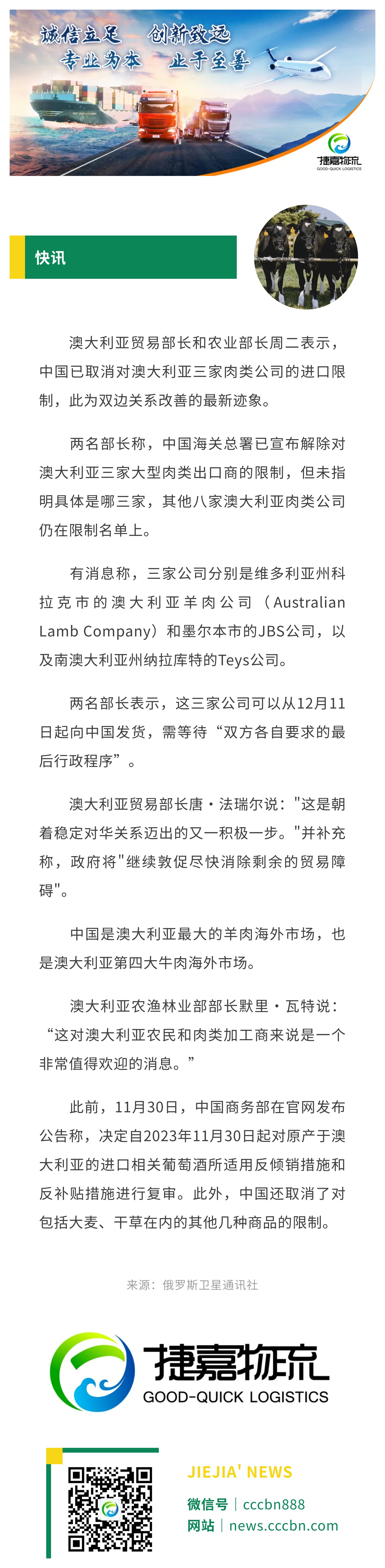 境外涉农 | 中国解除对澳大利亚三家肉类公司的进口限制