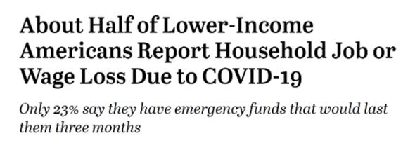 据美国皮尤研究中心的调查,自美国联邦政府发布居家令后,约52%的低收入美国人经历过或其家人经历过工作剧变。而在所有美国成年人口中,这一比例为43%。只有23%的低收入美国人表示他们有足够的应急资金维持三个月的基本生活。