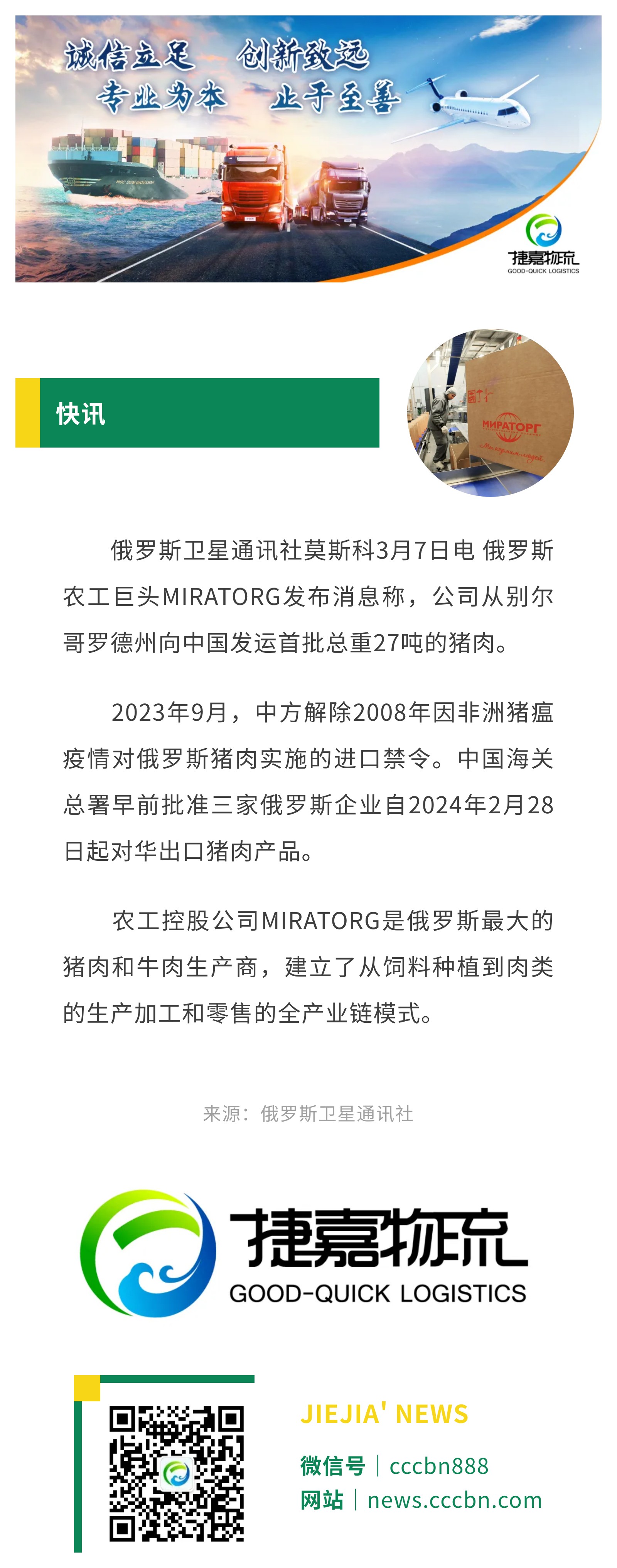 境外涉农 | 俄农工巨头MIRATORG向中国发运首批猪肉