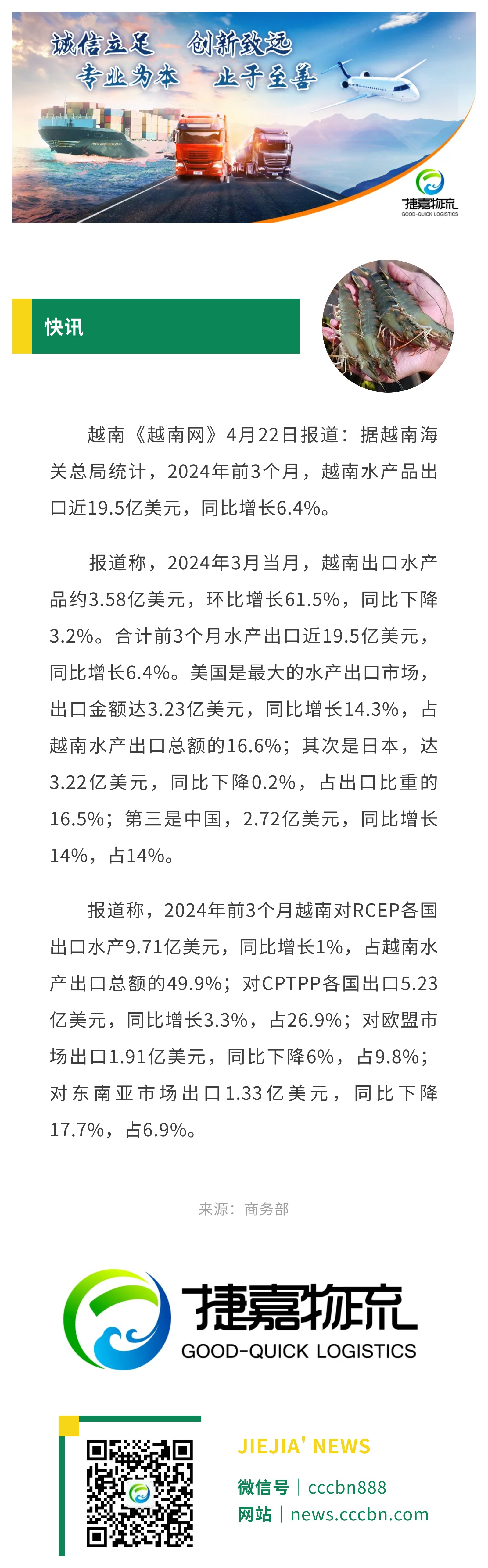 境外涉农 | 2024年前3个月越南水产出口同比增长6.4%,中国是第三大出口市场