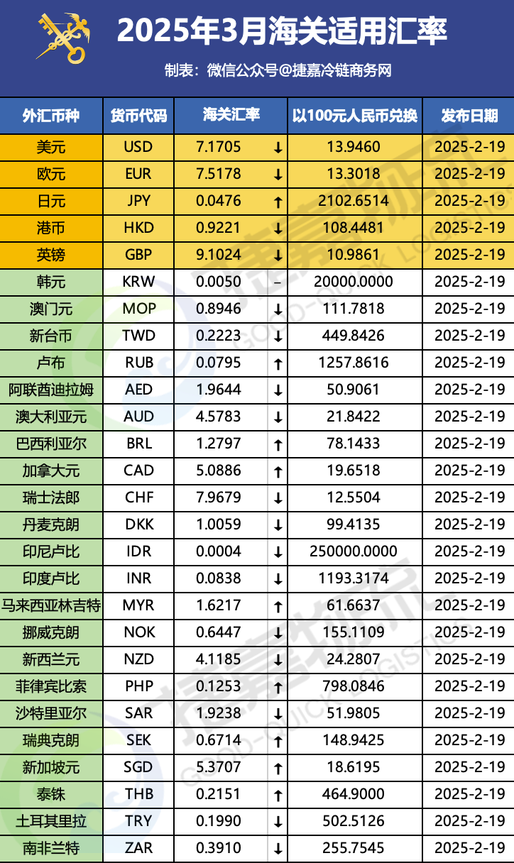 2025年3月海关汇率(对比)
