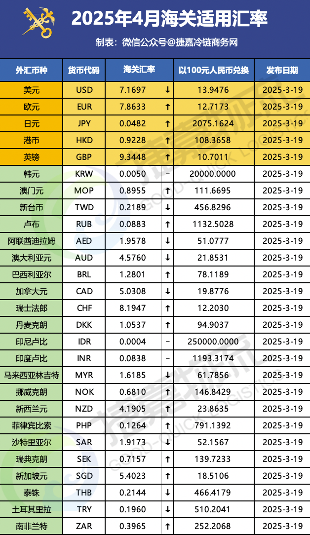 境外涉农 | 2025年4月海关适用汇率