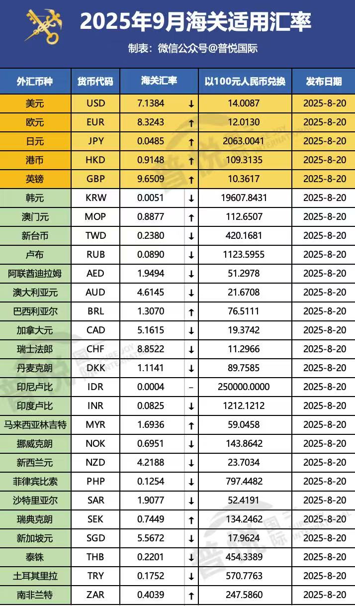 2025年9月海关汇率(对比)