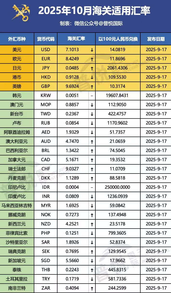 2025年10月海关汇率