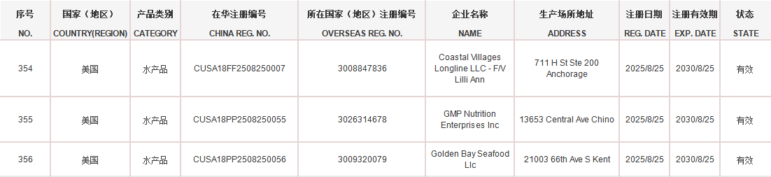 海关总署新增美国4家水产品企业输华注册(注册编码为:3008937784、3008847836、3026314678、3009320079)自2025年8月25日及之后生产的符合中国要求的水产品允许输华。