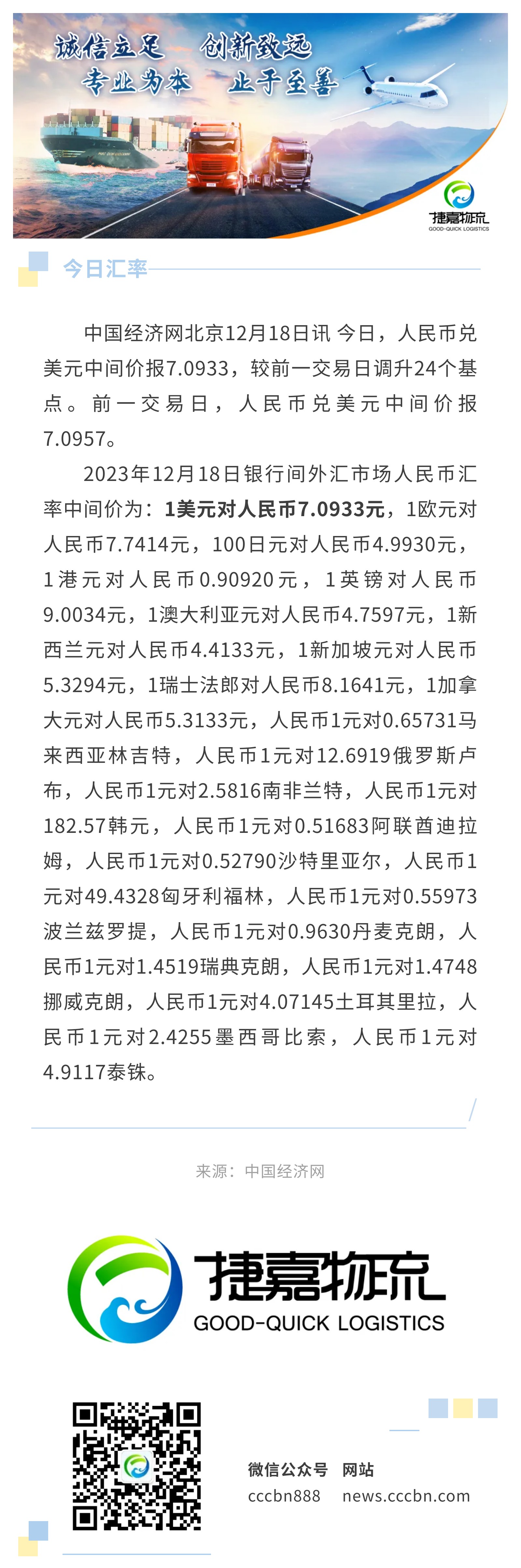12月18日人民币兑美元中间价报7.0933,调升24个基点