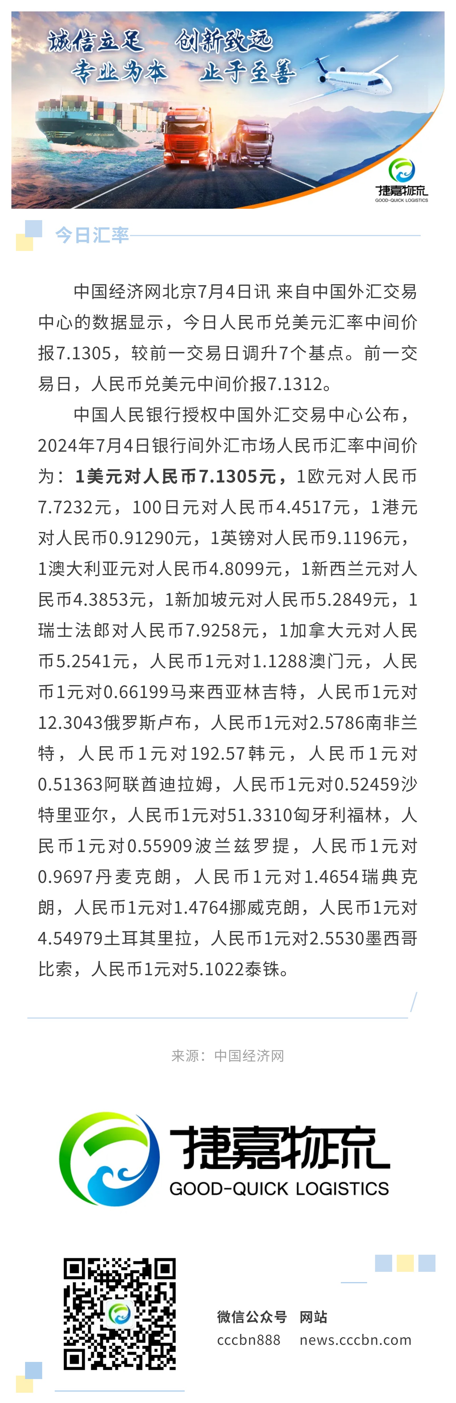 7月4日人民币兑美元中间价报7.1305,调升7个基点