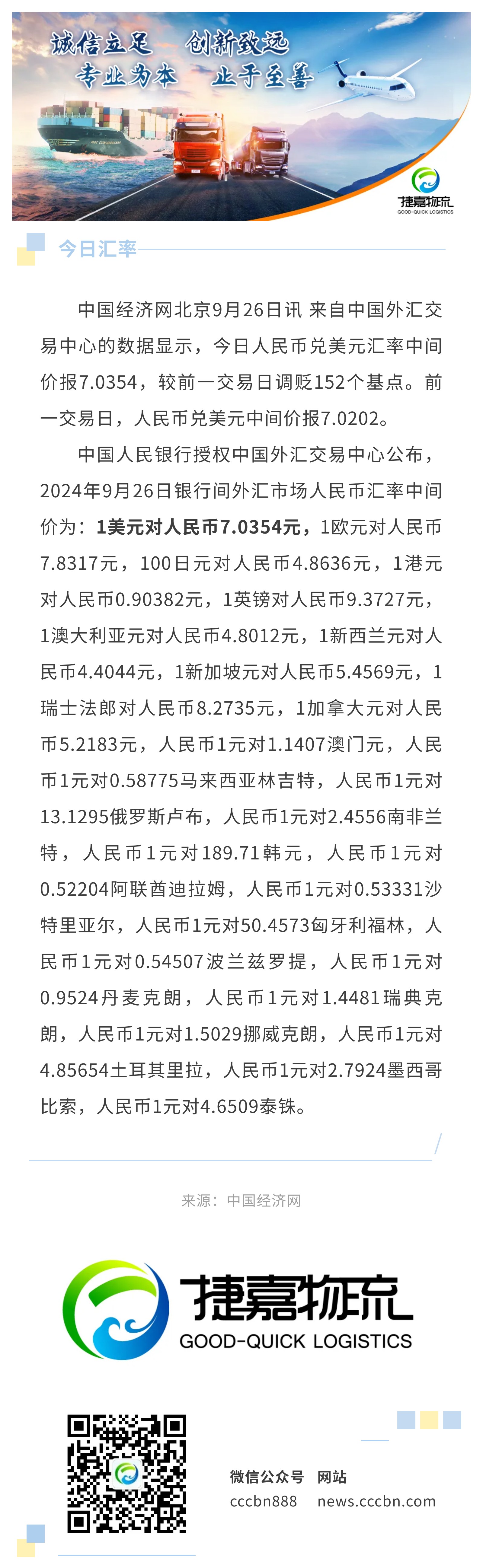 9月26日人民币兑美元中间价报7.0354,调贬152个基点