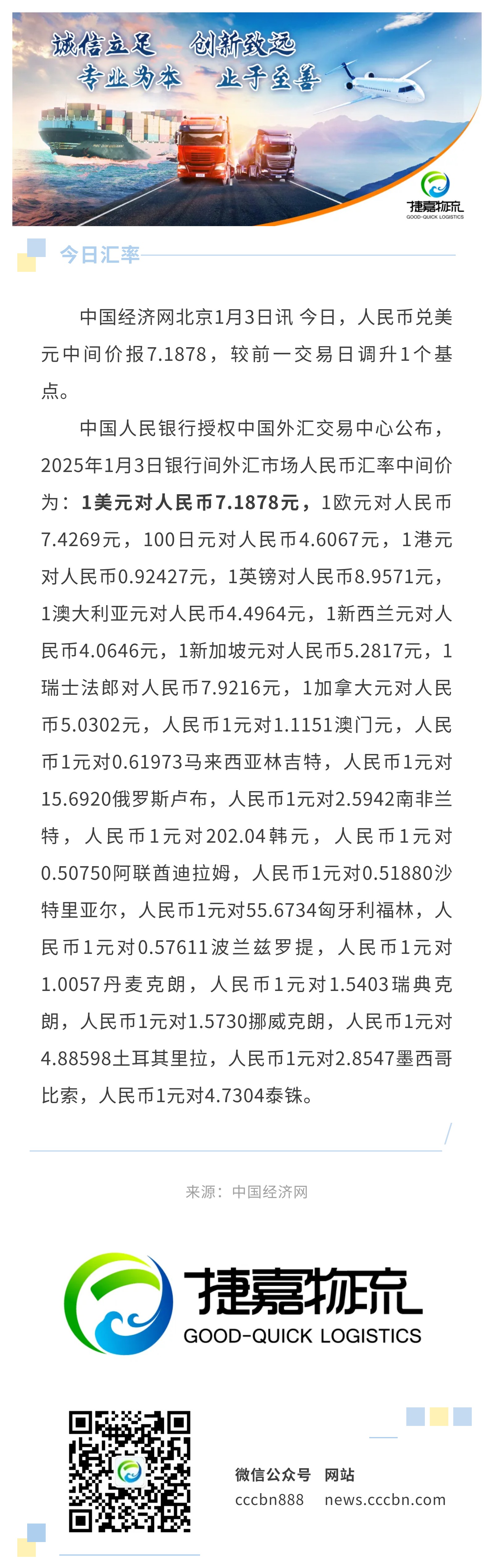 1月3日人民币兑美元中间价报7.1878,调升1个基点