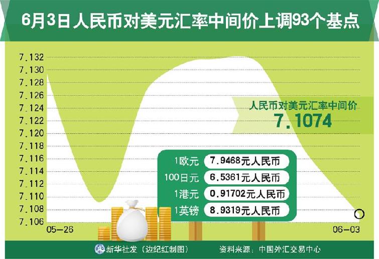 图表:6月3日人民币对美元汇率中间价上调93个基点 新华社发 边纪红 制图