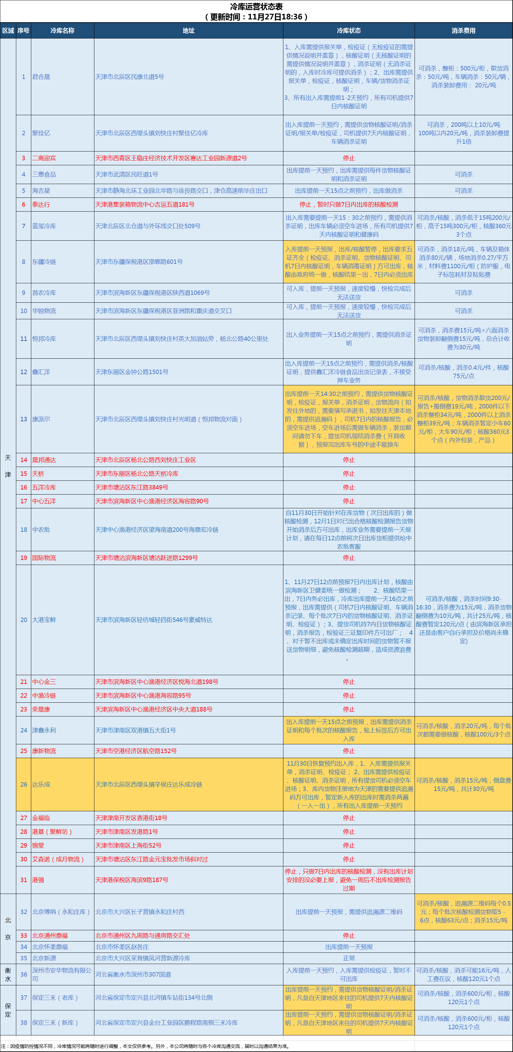 捷嘉 · 战“疫” | 冷库运营状态表(最后更新:11月27日18:36)