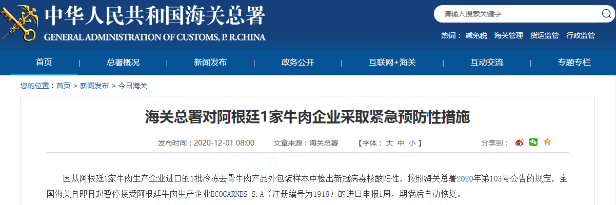 因从阿根廷1家牛肉生产企业进口的1批冷冻去骨牛肉产品外包装样本中检出新冠病毒核酸阳性,按照海关总署2020年第103号公告的规定,全国海关自即日起暂停接受阿根廷牛肉生产企业ECOCARNES S.A(注册编号为1918)的进口申报1周,期满后自动恢复。