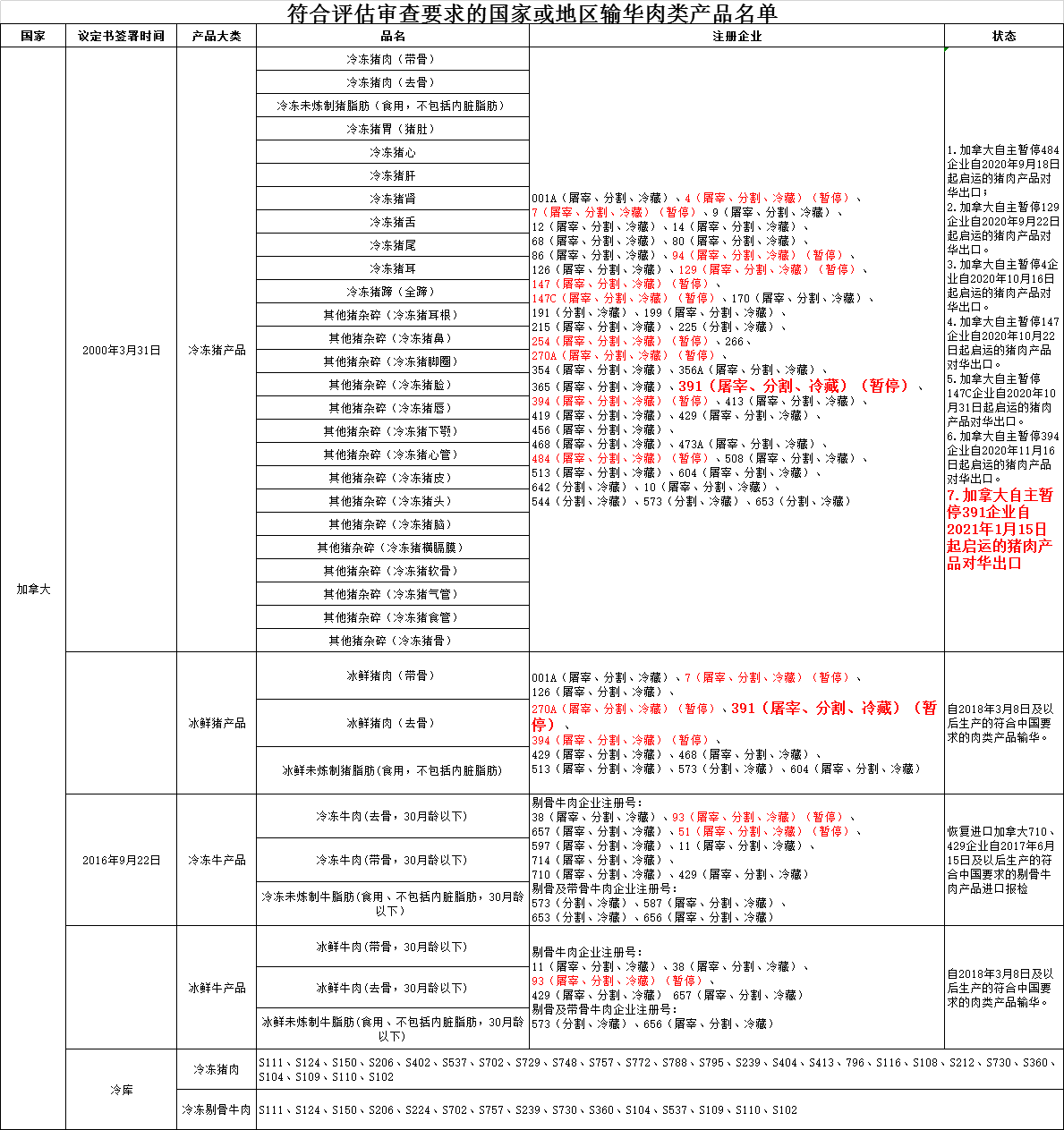 海关总署 |【准入更新】加拿大1家肉类企业自主暂停对华出口(2021年1月20日更新)