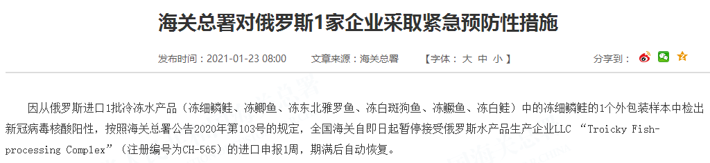 因从俄罗斯进口1批冷冻水产品(冻细鳞鲑、冻鲫鱼、冻东北雅罗鱼、冻白斑狗鱼、冻鳜鱼、冻白鲑)中的冻细鳞鲑的1个外包装样本中检出新冠病毒核酸阳性,按照海关总署公告2020年第103号的规定,全国海关自即日起暂停接受俄罗斯水产品生产企业LLC “Troicky Fish-processing Complex”(注册编号为CH-565)的进口申报1周,期满后自动恢复。