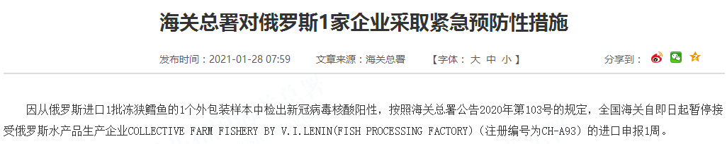 因从俄罗斯进口1批冻狭鳕鱼的1个外包装样本中检出新冠病毒核酸阳性,按照海关总署公告2020年第103号的规定,全国海关自即日起暂停接受俄罗斯水产品生产企业COLLECTIVE FARM FISHERY BY V.I.LENIN(FISH PROCESSING FACTORY)(注册编号为CH-A93)的进口申报1周。