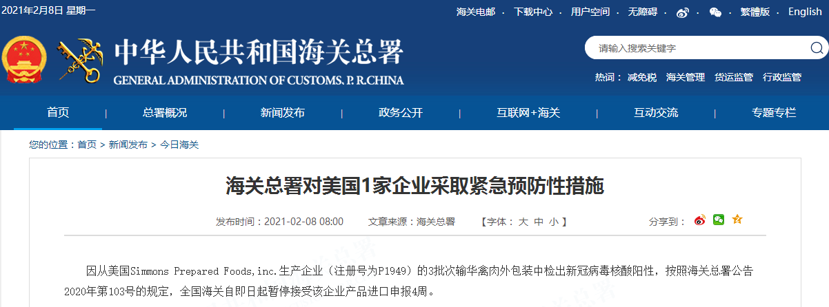 因从美国Simmons Prepared Foods,inc.生产企业(注册号为P1949)的3批次输华禽肉外包装中检出新冠病毒核酸阳性,按照海关总署公告2020年第103号的规定,全国海关自即日起暂停接受该企业产品进口申报4周。