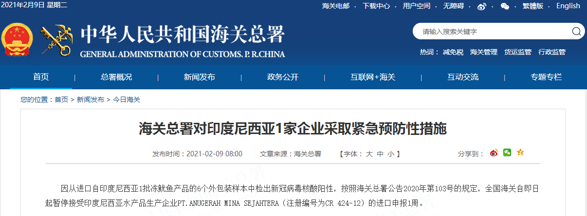 因从进口自印度尼西亚1批冻鱿鱼产品的6个外包装样本中检出新冠病毒核酸阳性,按照海关总署公告2020年第103号的规定,全国海关自即日起暂停接受印度尼西亚水产品生产企业PT.ANUGERAH MINA SEJAHTERA(注册编号为CR 424-12)的进口申报1周。
