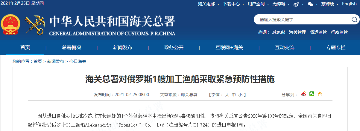 因从进口自俄罗斯1批冷冻北方长额虾的1个外包装样本中检出新冠病毒核酸阳性,按照海关总署公告2020年第103号的规定,全国海关自即日起暂停接受俄罗斯加工渔船Aleksandrit “Promflot” Co., Ltd(注册编号为CH-724)的进口申报1周。