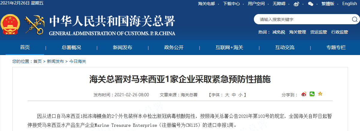 因从进口自马来西亚1批冻海鳗鱼的2个外包装样本中检出新冠病毒核酸阳性,按照海关总署公告2020年第103号的规定,全国海关自即日起暂停接受马来西亚水产品生产企业Marine Treasure Enterprise(注册编号为CN115)的进口申报1周。