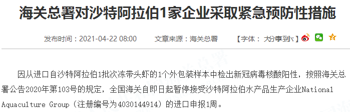 因从进口自沙特阿拉伯1批次冻带头虾的1个外包装样本中检出新冠病毒核酸阳性,按照海关总署公告2020年第103号的规定,全国海关自即日起暂停接受沙特阿拉伯水产品生产企业National Aquaculture Group(注册编号为4030144914)的进口申报1周。