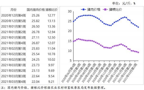 养殖收益继续下降。生猪价格明显下跌,饲料价格持续上涨,养殖收益继续下降。据农业农村部监测,3月份,猪粮比价9.60:1,比上月下降1.01个点。3月份,全国饲用玉米价格每公斤2.99元,环比涨1.4%,同比涨41.0%;育肥猪配合饲料价格每公斤3.62元,环比涨0.3%,同比涨16.0%。从全国平均水平看,自繁自养的生猪养殖利润每头1867元,环比减12.0%,同比减37.4%;外购仔猪的生猪养殖利润每头530元,环比减37.8%,同比减60.7%。