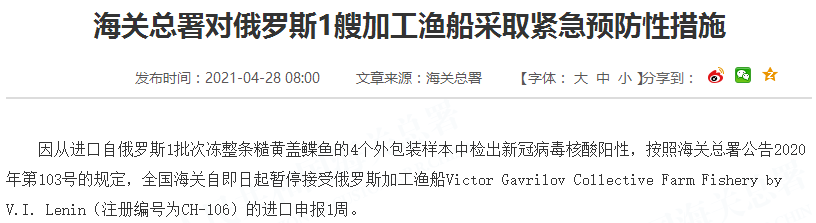 因从进口自俄罗斯1批次冻整条糙黄盖鲽鱼的4个外包装样本中检出新冠病毒核酸阳性,按照海关总署公告2020年第103号的规定,全国海关自即日起暂停接受俄罗斯加工渔船Victor Gavrilov Collective Farm Fishery by V.I. Lenin(注册编号为CH-106)的进口申报1周。
