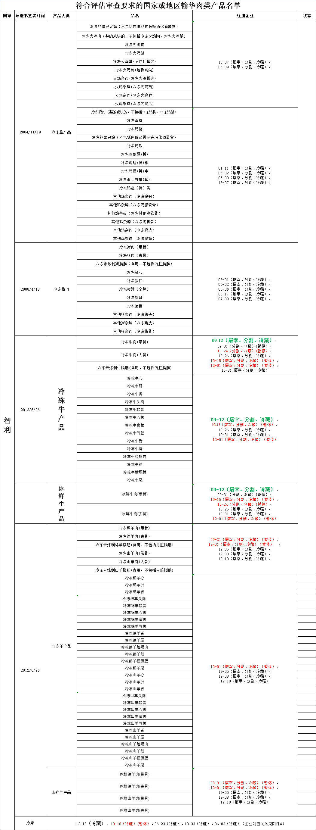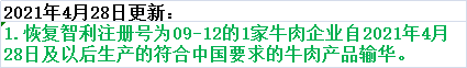 ⬆ 恢复智利注册号为09-12的1家牛肉企业自2021年4月28日及以后生产的符合中国要求的牛肉产品输华。