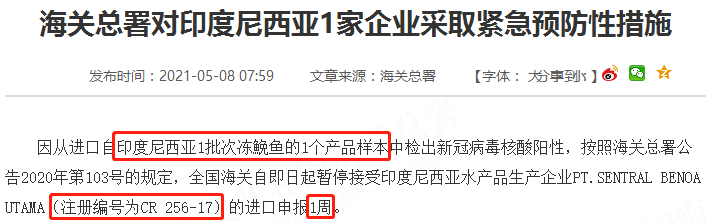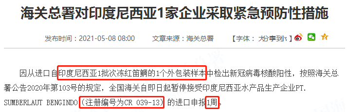因从进口自印度尼西亚1批次冻红笛鲷的1个外包装样本中检出新冠病毒核酸阳性,按照海关总署公告2020年第103号的规定,全国海关自即日起暂停接受印度尼西亚水产品生产企业PT. SUMBERLAUT BENGINDO(注册编号为CR 039-13)的进口申报1周。