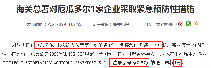 因从进口自厄瓜多尔1批次冻去头南美白虾的各1个外包装和内包装样本中检出新冠病毒核酸阳性,按照海关总署公告2020年第103号的规定,全国海关自即日起暂停接受厄瓜多尔水产品生产企业CULTIVO Y EXPORTACION ACUICOLA CEAEXPORT S.A.(注册编号为7057)的进口申报1周。