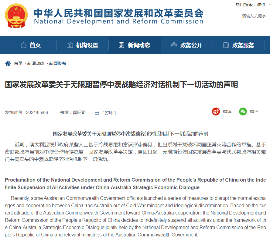 Proclamation of the National Development and Reform Commission of the People’s Republic of China on the Indefinite Suspension of All Activities under China-Australia Strategic Economic Dialogue