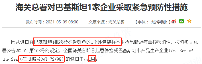 因从进口自巴基斯坦1批次冷冻舌鳎鱼的1个外包装样本中检出新冠病毒核酸阳性,按照海关总署公告2020年第103号的规定,全国海关自即日起暂停接受巴基斯坦水产品生产企业M/s. Son of the Sea(注册编号为T-72/98)的进口申报1周。