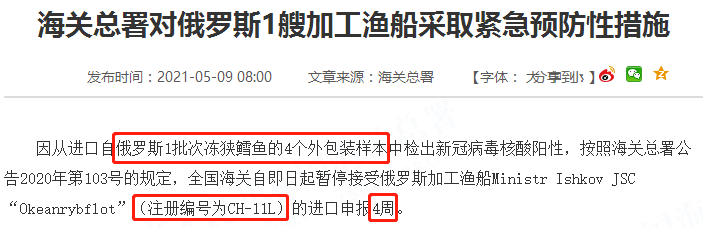 因从进口自俄罗斯1批次冻狭鳕鱼的4个外包装样本中检出新冠病毒核酸阳性,按照海关总署公告2020年第103号的规定,全国海关自即日起暂停接受俄罗斯加工渔船Ministr Ishkov JSC “Okeanrybflot”(注册编号为CH-11L)的进口申报4周。