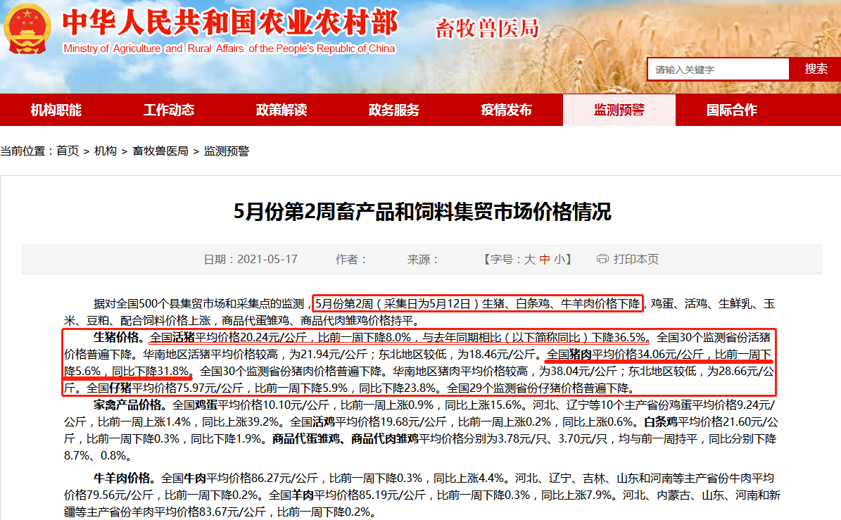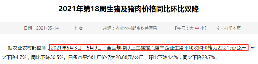 据农业农村部监测,2021年5月3日—5月9日,全国规模以上生猪定点屠宰企业生猪平均收购价格为22.21元/公斤,环比下降4.7%,同比下降30.5%。白条肉平均出厂价格为28.88元/公斤,环比下降4.4%,同比下降29.7%。