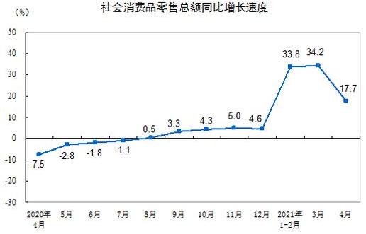 2021年4月份社会消费品零售总额33153亿元,同比增长17.7%,比2019年4月份增长8.8%。