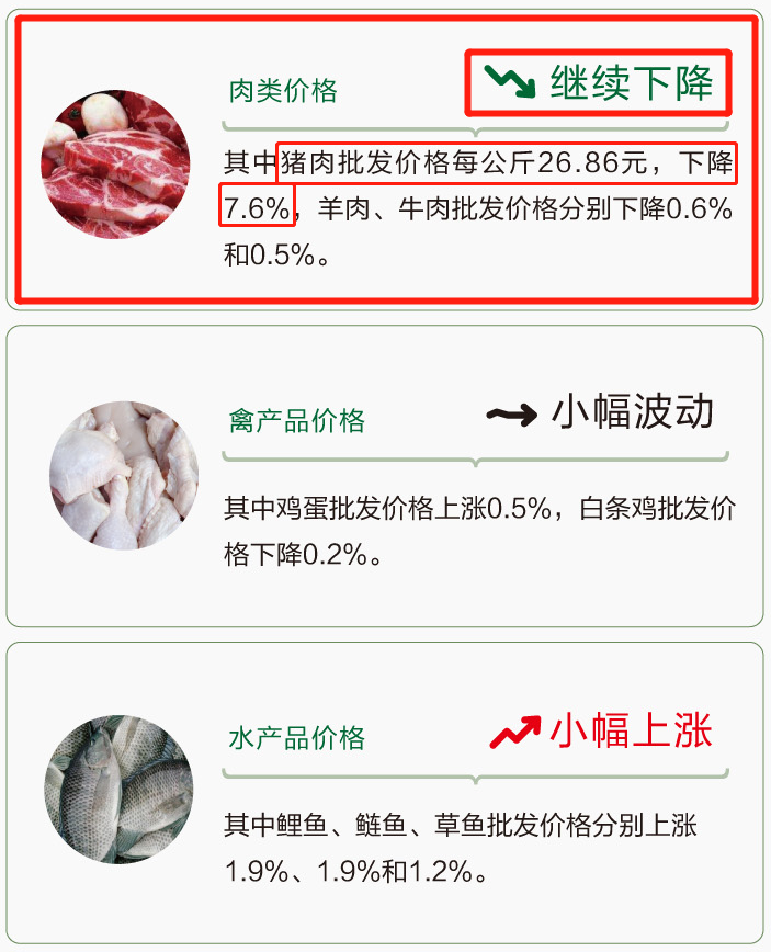 肉类价格继续下降,其中猪肉批发价格每公斤26.86元,下降7.6%,羊肉、牛肉批发价格分别下降0.6%和0.5%。