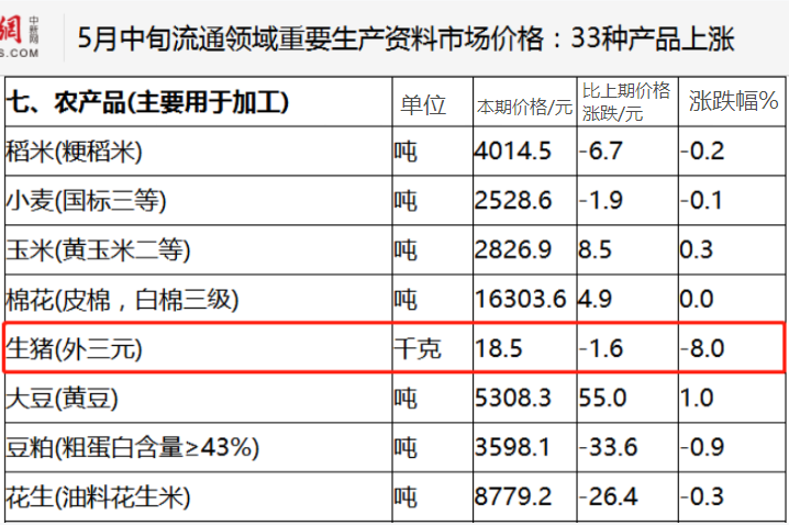 国家统计局网站24日公布2021年5月中旬流通领域重要生产资料市场价格变动情况,据对全国流通领域9大类50种重要生产资料市场价格的监测显示,2021年5月中旬与5月上旬相比,33种产品价格上涨,13种下降,4种持平。生猪(外三元)18.5元/千克,比上周跌1.6元,跌幅8%。