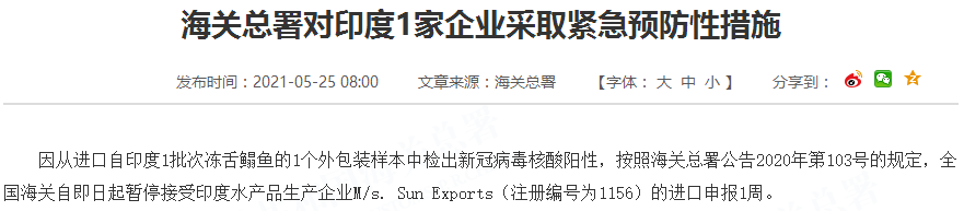 因从进口自印度1批次冻舌鳎鱼的1个外包装样本中检出新冠病毒核酸阳性,按照海关总署公告2020年第103号的规定,全国海关自即日起暂停接受印度水产品生产企业M/s. Sun Exports(注册编号为1156)的进口申报1周。